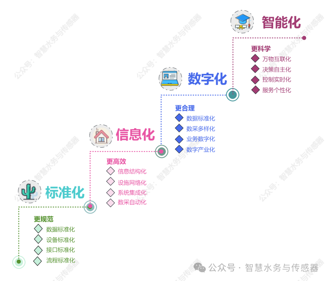智慧水務(wù)領(lǐng)域中的標(biāo)準(zhǔn)化、信息化、數(shù)字化與智能化發(fā)表時(shí)間:2024-04-26 09:00 如下圖所示,標(biāo)準(zhǔn)化、信息化、數(shù)字化和智能化這幾個(gè)概念的層級(jí)遞進(jìn)關(guān)系,各自的特點(diǎn),以及該階段的目標(biāo)。